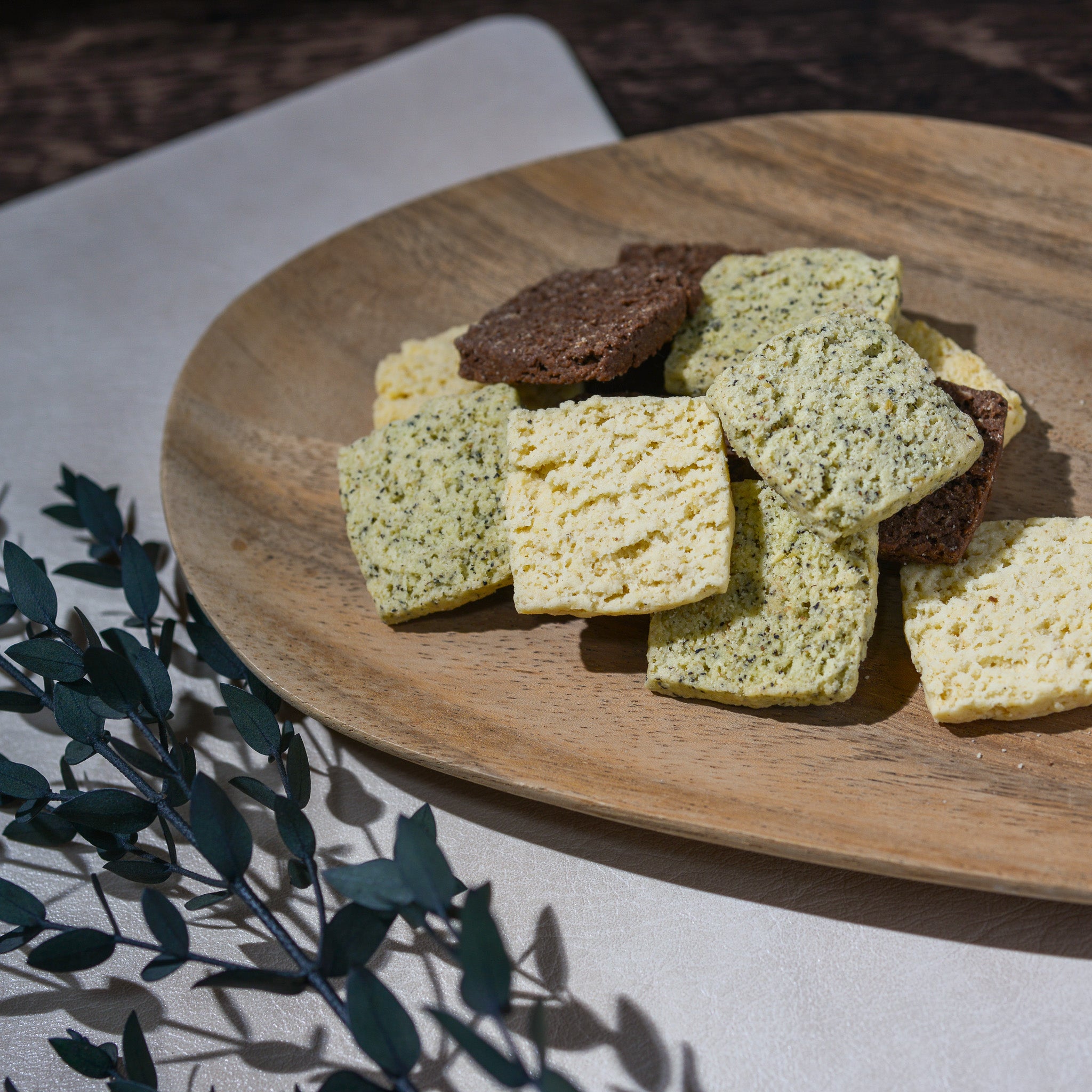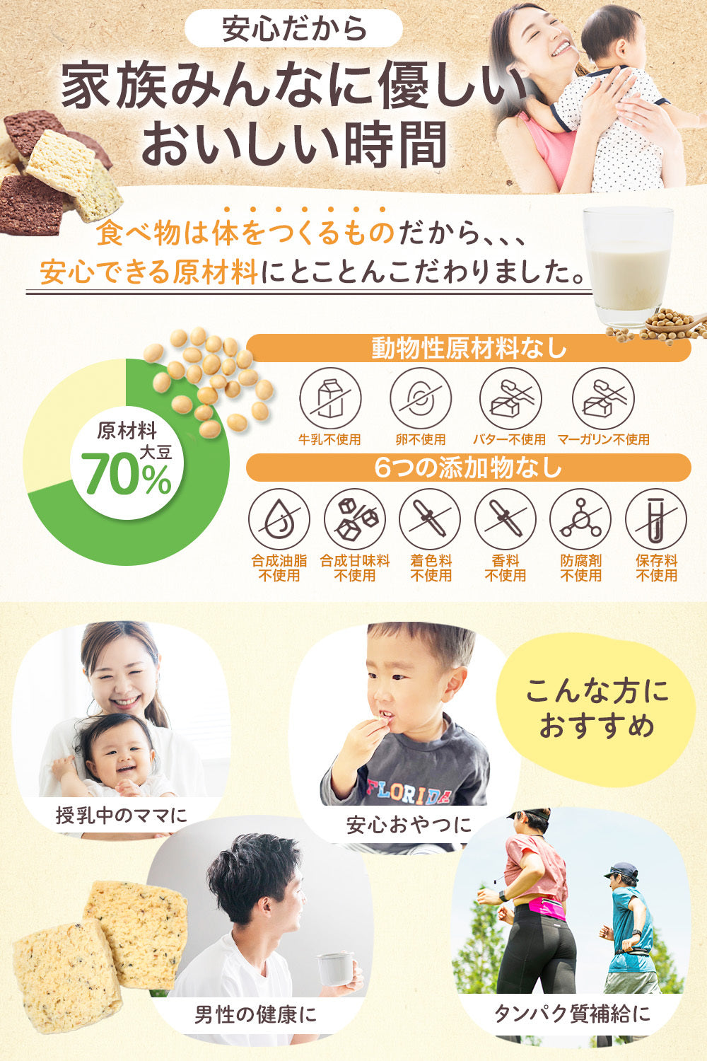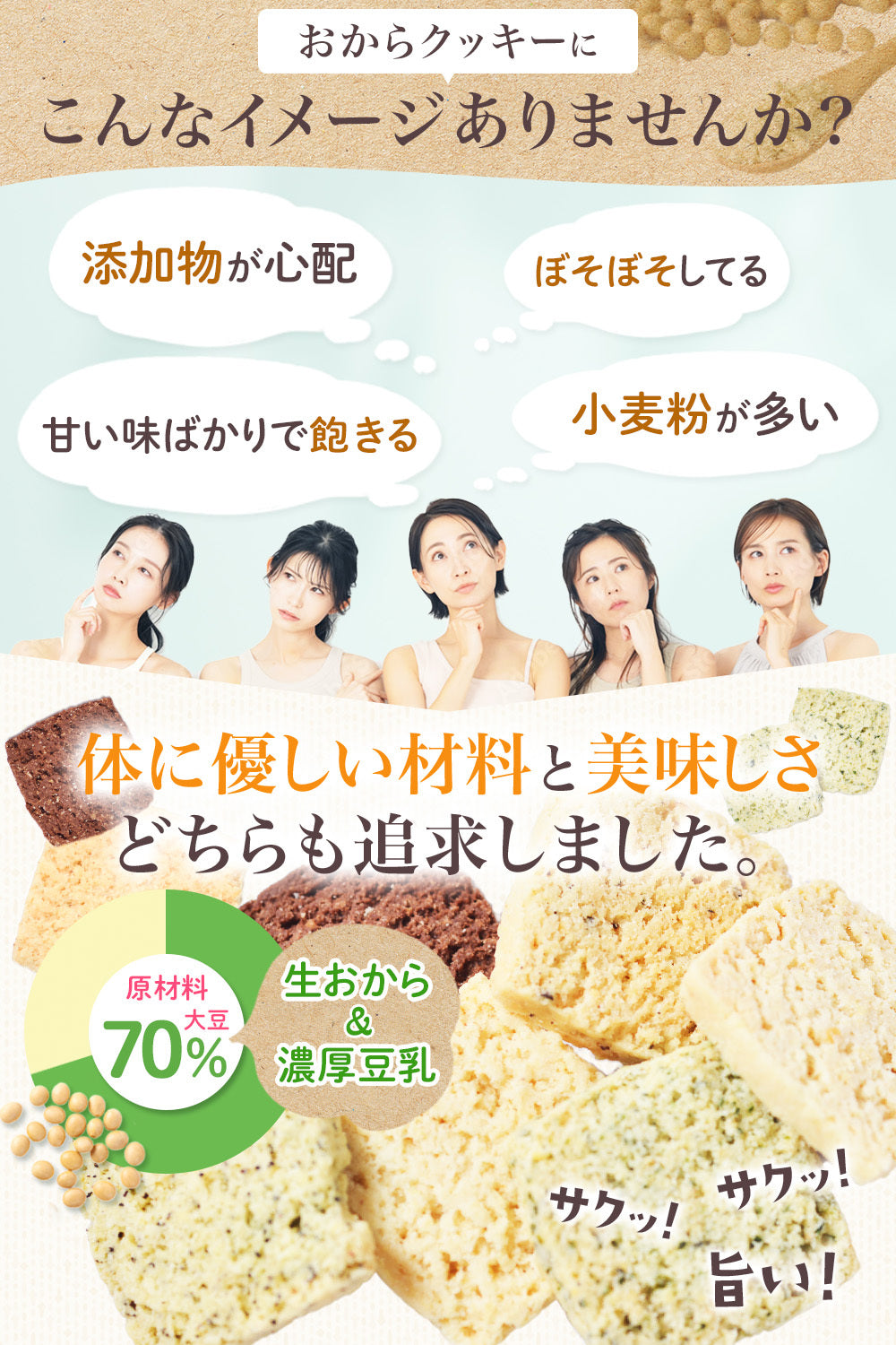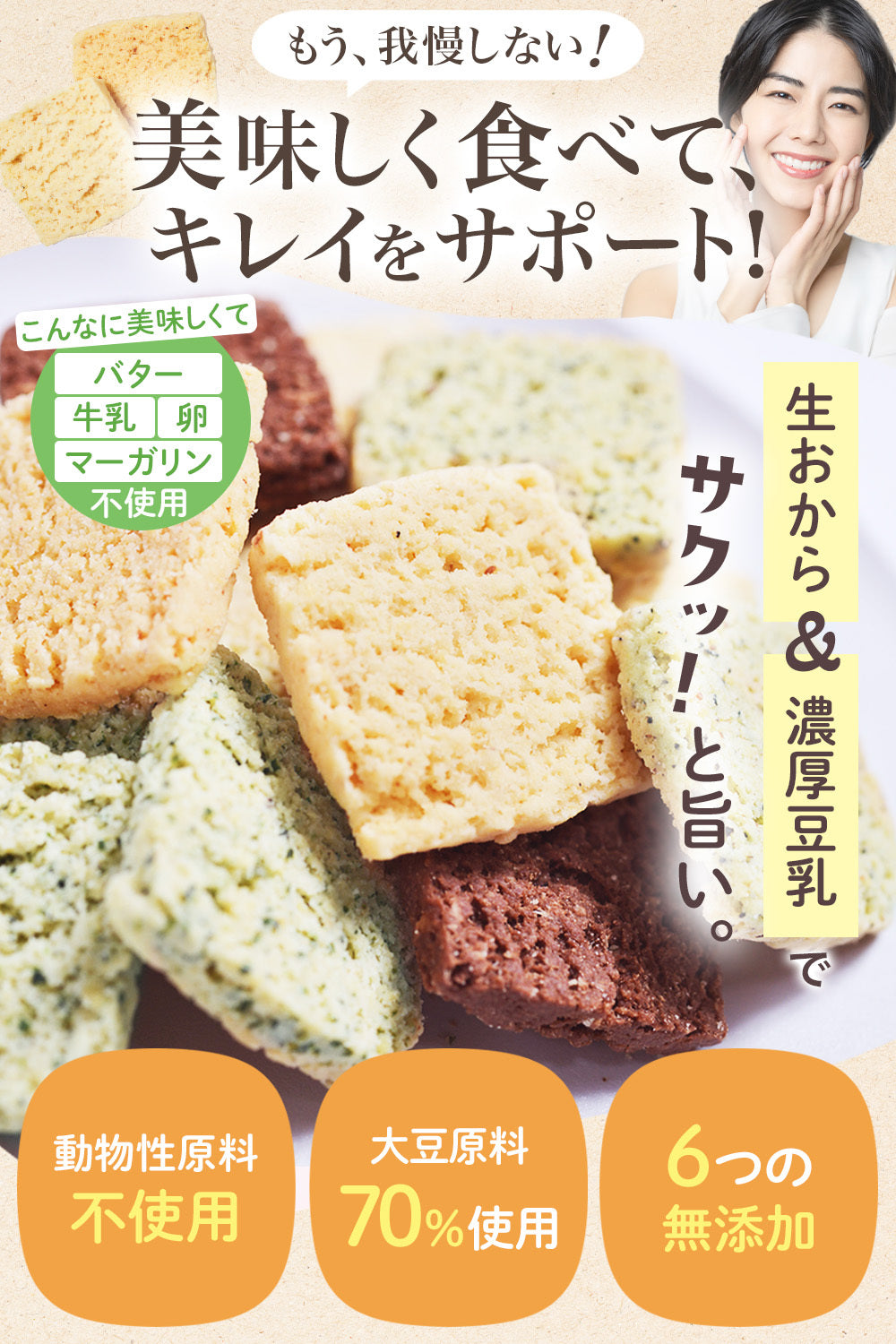 本来クッキーには欠かせない「牛乳・卵・マーガリン・バター」を使用しなくても独自技術と工夫で生おからクッキーならではの美味しさを実現しました。